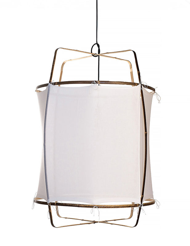 The Ay illuminate Z1 Black Bamboo pendant has a handcrafted black bamboo frame sheathed in a delicately woven shade of hand-knit white cotton.