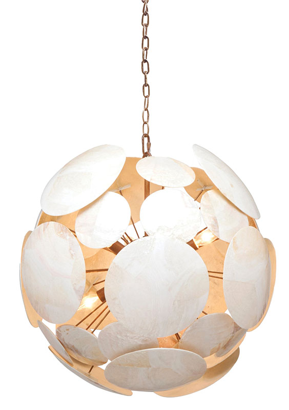The Made Goods Elba vintage-inspired take on a sputnik chandelier. Large discs of luminous kabibe shell in varying diameters create a dynamically abstract feel.