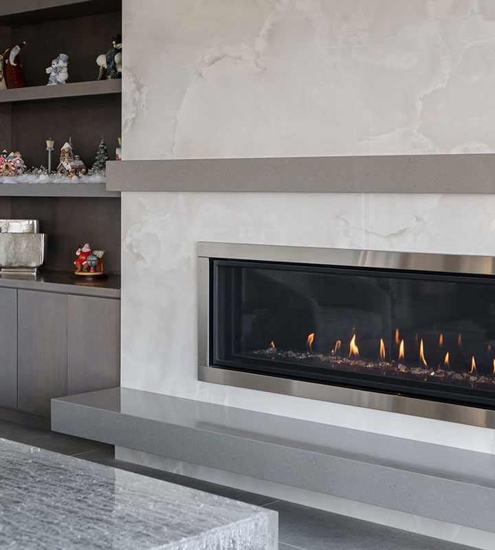 A custom fireplace by Progranite Surfaces is wrapped in Helena Dekton from Cosentino with a floating hearth and shelf in Concerto Quartz.