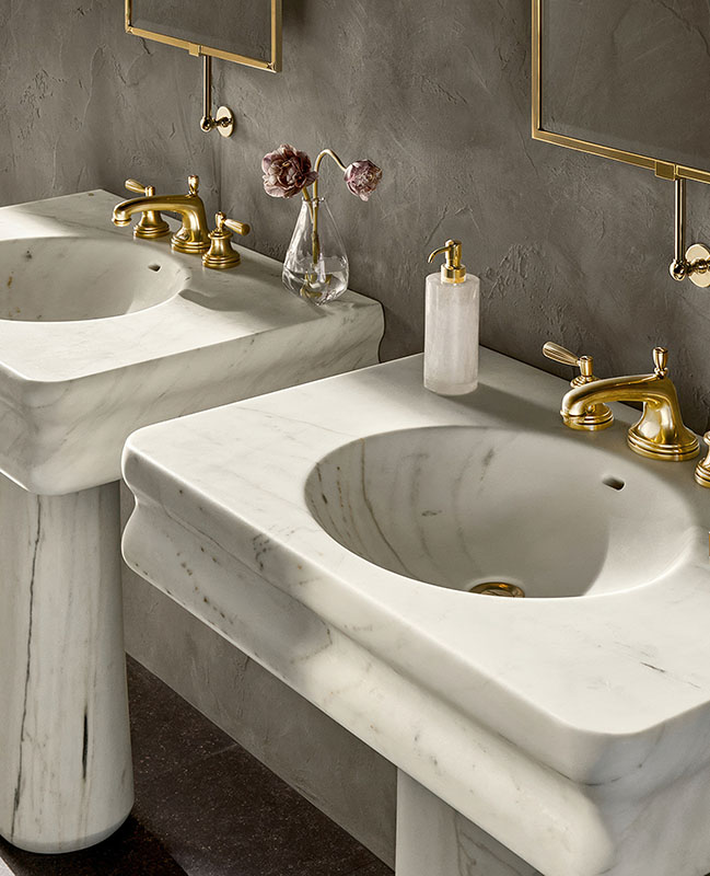 Debbie Cahill Turner Design installs a pair of Waterworks Centuria Deck Mounted Paonazzo Marble Lavatory Sinks with tapered pedestals.