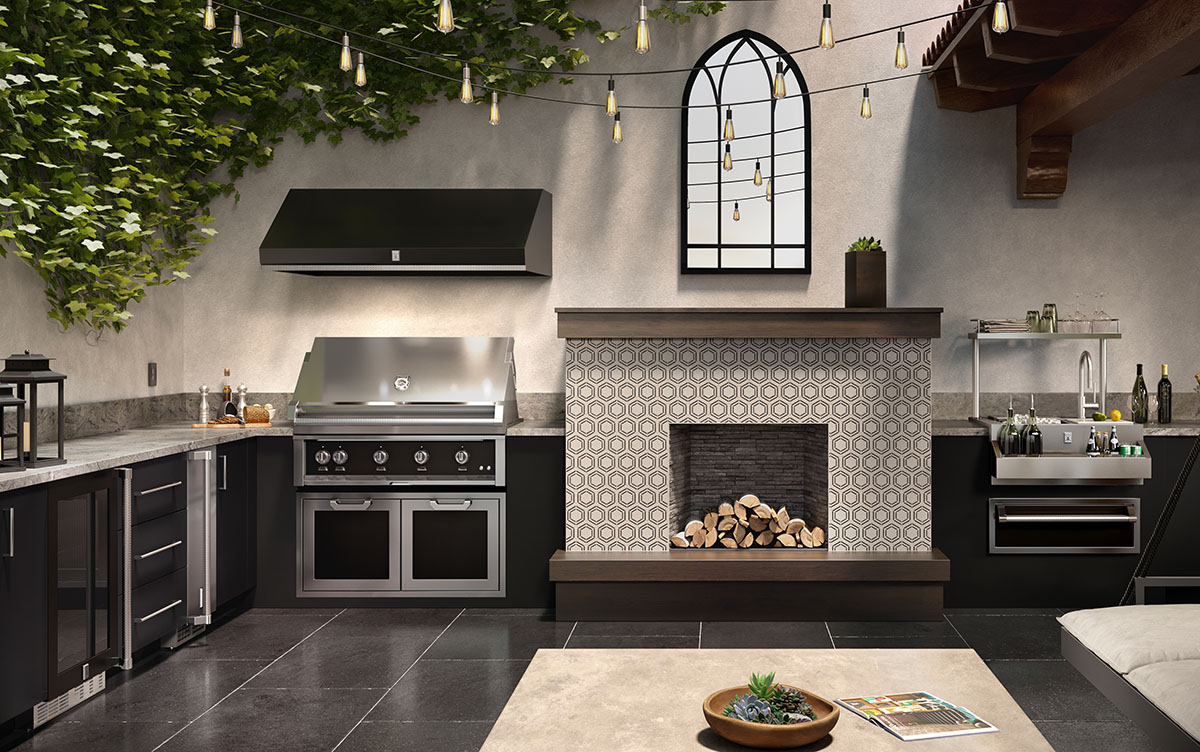 Build your dream outdoor kitchen with Hestan, which could include a built-in grill and hood, under-counter refrigerator, ice maker, storage drawers, and refreshment center.
