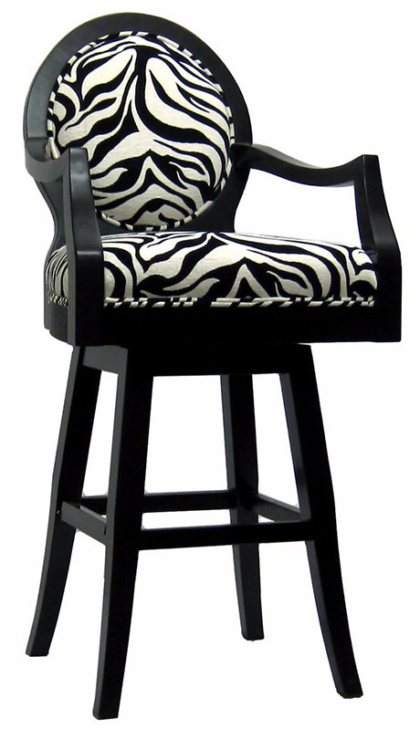 The lively Zebra Print Swivel Bar Stool from Pacific Imports, Inc., offers seating with just the right amount of panache. Comfort abounds with a padded back and curved armrests.