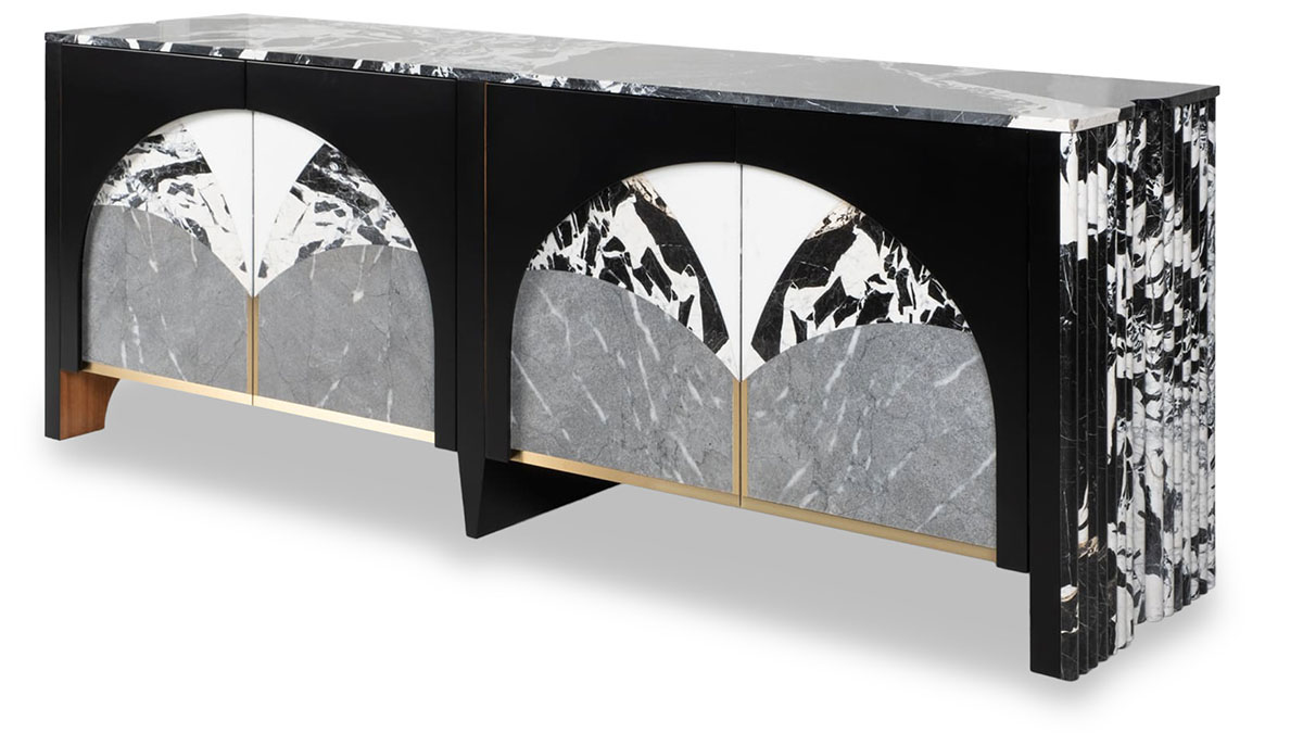 With arches crafted from three distinct marbles in the pattern of gingko leaves, Greenapple’s Biloba marble sideboard draws inspiration from Portugal’s Alcobaça Monastery.