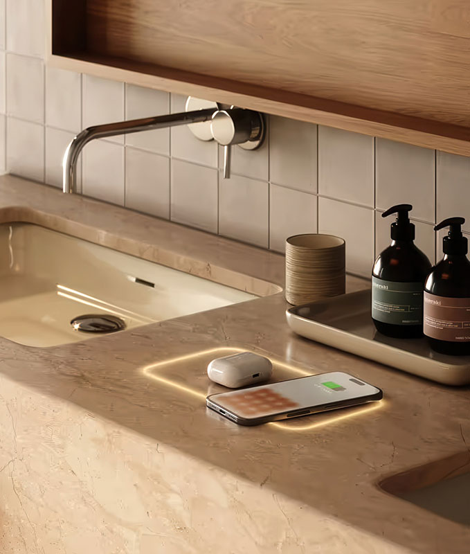 Designer Debbie Cahill Turner shared an exciting reimagined wireless charging technology, FreePower, which is mounted into stone bringing power to every surface.
