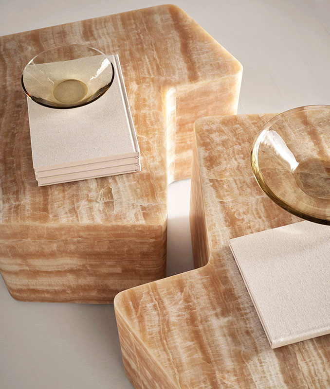 The Lao Cocktail Table exudes a luxe presence, in a unique L-shaped structure in rich honed Honey Onyx. A statement piece that feels modern and timeless.
