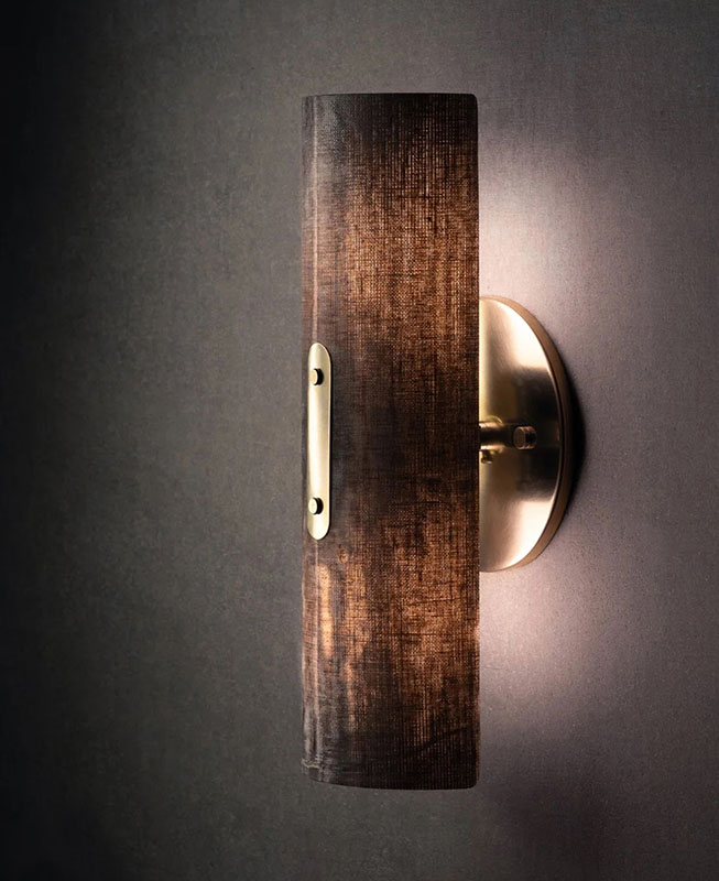 A Mutuus Made, Daro half-round sconce is created with hand-sanded linen micarta, giving the shade an eroded and weathered appearance.
