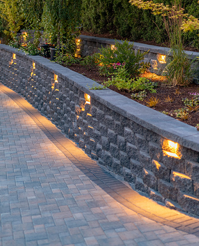 An inviting driveway by Western Interlock is built with Leiden Stone in Jamestown Blend and a Jumbo Nursery Stone retaining wall in charcoal.