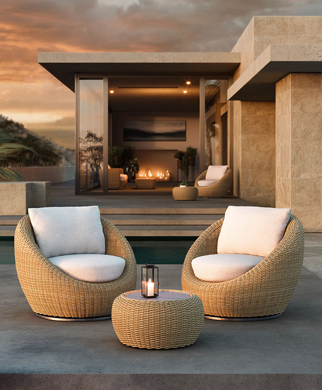 Get a rest from the typical with Velo by Jensen Outdoor, a handwoven oasis in camel tones. Rounded natural furnishings are turned into comfort with strong Solara fiber, handwoven around a powder-coated aluminum frame.