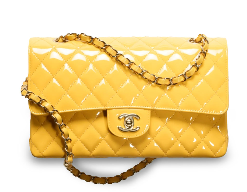 Playing with volumes and layers, the Chanel Double Flap Tote in Classic Yellow is created with quilted lambskin and a chain-leather strap.
