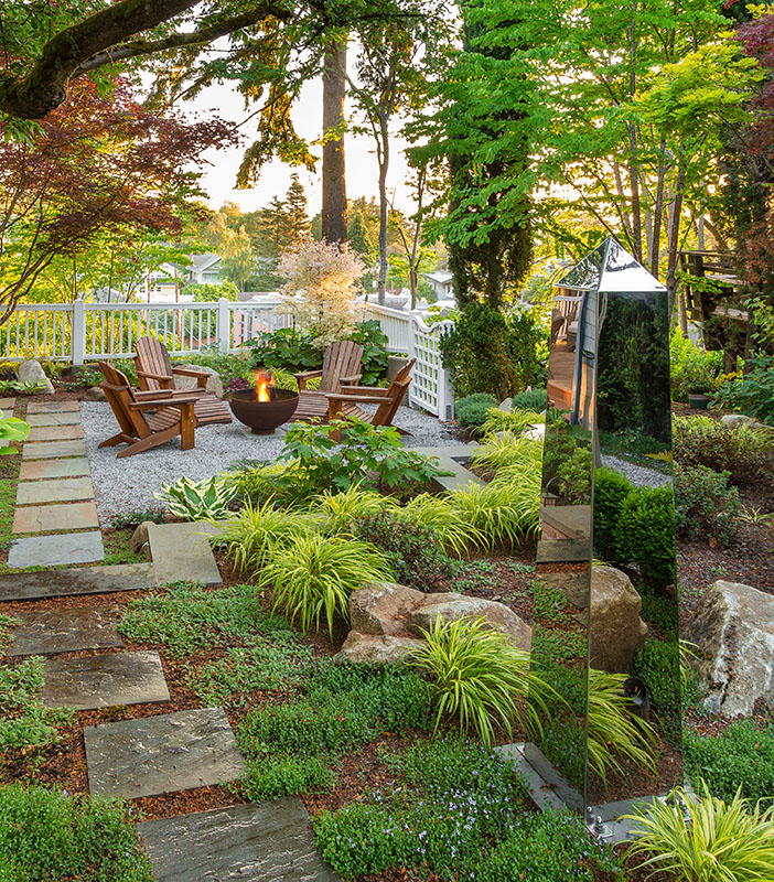 A fire pit and seating area are surrounded by a landscape design full of lush color and texture by Cambium. Granite boulders contrast with a mirror polished 5’ tall steel obelisk and golden forest grass softens them both. Mature big leaf maples give needed height and maturity while native grasses and perennials were carefully planned to offer year-round color.