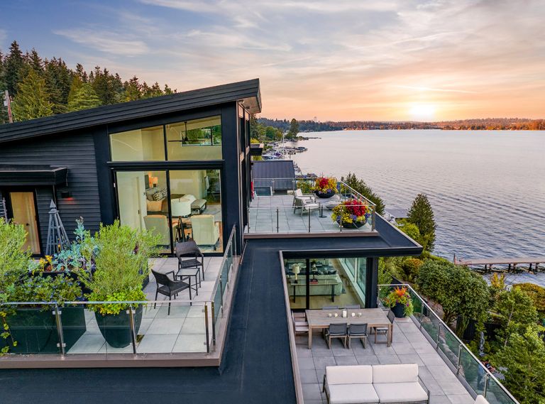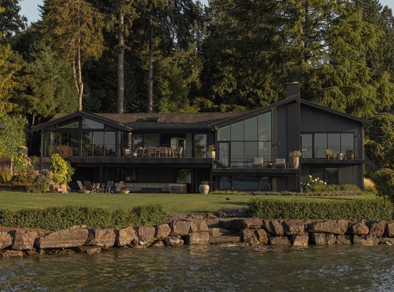 Sturman Architects and March-MacDonald, Inc. transform a waterside Lake Mercer home by adding a steel moment frame and floor-to-ceiling windows alongside multiple decks that open onto extraordinary 180-degree lake views.