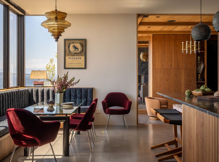Well-loved furniture comingles with a medley of unexpected materials, from burnished concrete, warm wood, and wallcoverings, in this one-of-a-kind beach house by Alix Day Architecture + Design and Bakstad Construction.
