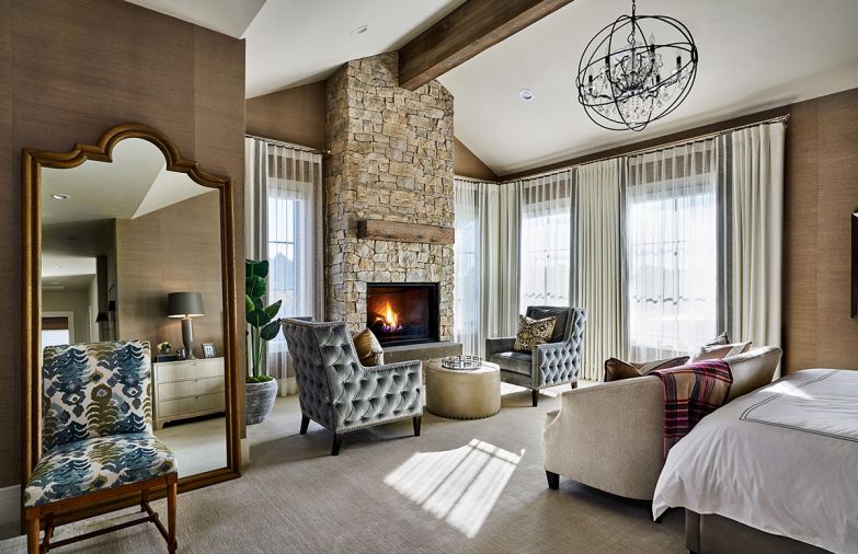 “I didn’t want to feel like I was living in a log cabin,” she says. “Thankfully, Garrison’s team mixed the materials well. The exposed beams found throughout the house are always accompanied by elegant materials such as the Shanghai Collection silk grasscloth we used on the master bedroom walls and the tear drop chandelier wrapped in rustic metal.”