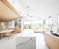 To tone down the warm tones of all that wood, Matt and his team also incorporated new materials to add cooler colors and lighten up the space further. In addition to utilizing bright white paint for many interior surfaces, they also installed Ann Sacks terrazzo tile on the floor, and veined Carrera marble on the kitchen countertops.