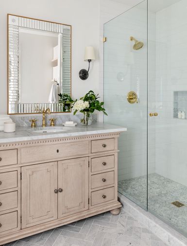 It all comes together in the reinvented kitchen, wherein Geneva swapped out waxy wood cabinets and tile counters for a more soothing medley. Now, creamy-toned Canyon Creek Cabinetry bedecked with aged brass hardware is balanced with handmade zellige tile and luminous honed marble counters. “We wanted to make the kitchen the heart of the home, because that’s where we really spend all of our time,” says Geneva, noting how the room embodies a sense of “peace and calm” – a sensibility that permeates the whole house now. “I wanted the whole flow of the house to be built around that.”