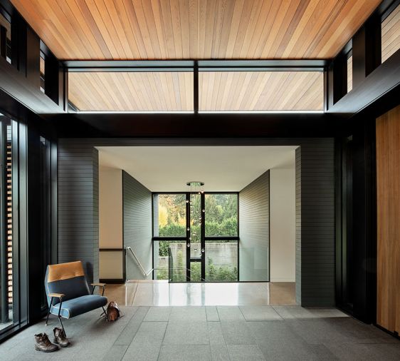 “We’d discussed the program of the home,” recalls Berry, “a bit of Asian influence, with Northwest regional style and Japanese flare to reflect their travels overseas.” After Berry serendipitously spotted a hillside lot for sale with a beautiful grove of trees, he recommended having their realtor look at it. The find proved providential, allowing Berry to do a code analysis to confirm the lot was legitimately buildable. He also noted how to shield the residence from neighbors, and where to nestle it into the hillside so that both front and back open onto the “mini forest.” “When the Weiland Liftslide doors are opened in the great room during summer mornings,” remarks Berry, “a warm breeze filters through, allowing you to experience the nature that surrounds you.”