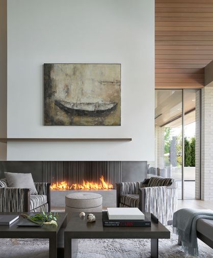 Always mindful of the tightknit neighborhood, Cavassa and Silk placed the primary suite on the upper floor, wrapping it in wood paneling, warmed by a Montigo fireplace topped with marble, echoing the central fireplace’s stunning but simple compositional design.