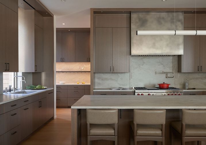 Interior designer Danielle Krieg of Studio AM, worked closely with Cavassa to add her own special sauce. “We collaborated well together,” says Krieg, who also did the architectural finishes, decorative lighting, and plumbing fixtures, “choosing warm materials, not too contrasting, so as not to distract from the spectacular view.” Fabrics and furnishings are kid friendly, while the great room’s area rug echo colors found in the exterior. Likewise, Toth childproofed the bottoms of the great room’s delicate wood columns with blackened steel to preserve their integrity.