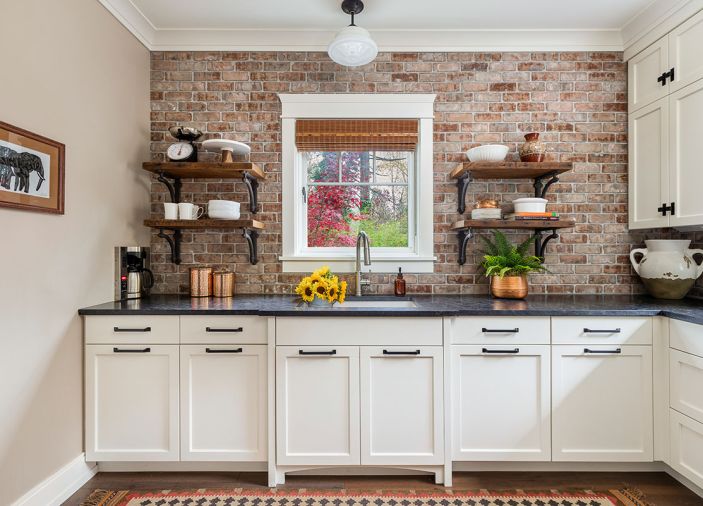 “The Franks’ primary goal was ‘timeless,’” said Ray. We looked to classic materials and base color palettes like warm whites and creams with darker accents.” Other materials include traditional subway tiles, natural brick, painted cabinets, crown molding, and natural stone countertops.