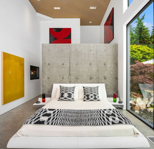 To that end, their statement was: “Modern industrial design inspired to showcase the flow of nature.” Now, the finished home does just that, melding modern and industrial components with a stunning panorama. Industrial exposed black steel is seen in the structural framework, windowsills, indoor and outdoor stairway railings, and stair spines, alongside a honed concrete floor, fireplace column, and accent wall in the primary bedroom. Meanwhile, the entire rear façade sports 90-feet of extra-tall windows and doors, capped with a band of five-foot-high clerestories to capture the views.