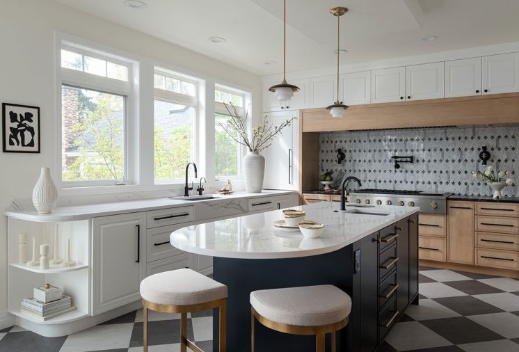 These two home cooks with diverse culinary styles were passionate about their practice, but hampered by an extensively damaged kitchen. Amanda George, CKBD upgraded their cooking experience by first optimizing the room’s layout, creating a focal wall around the cooktop, complete with warm wood cabinetry and tile backsplash, then specifying significant storage solutions throughout. Art Deco motifs are an added layer of elegance, from the pendant lights to the two-tone floor, the latter is actually a groutable commercial-grade vinyl that maintains the aesthetic and practicality, which fulfills the goal of “livable luxury” for everyday use.