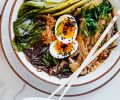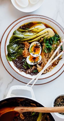 Spoon the soup into bowls. Top each with a halved egg, scallions, some of the jarred enoki mushrooms, a pinch of furikake, and some black sesame seeds over the eggs. Serve immediately.