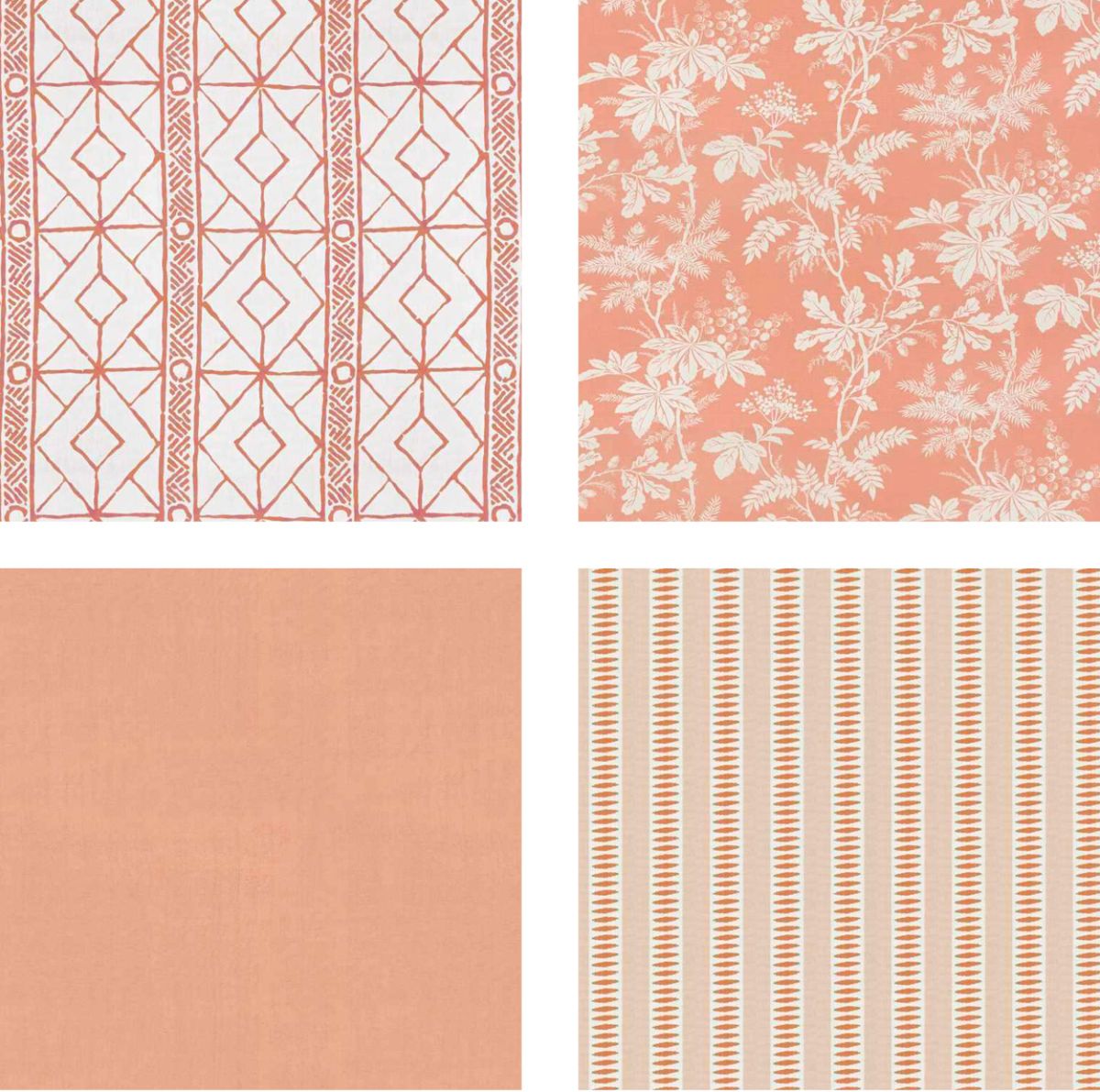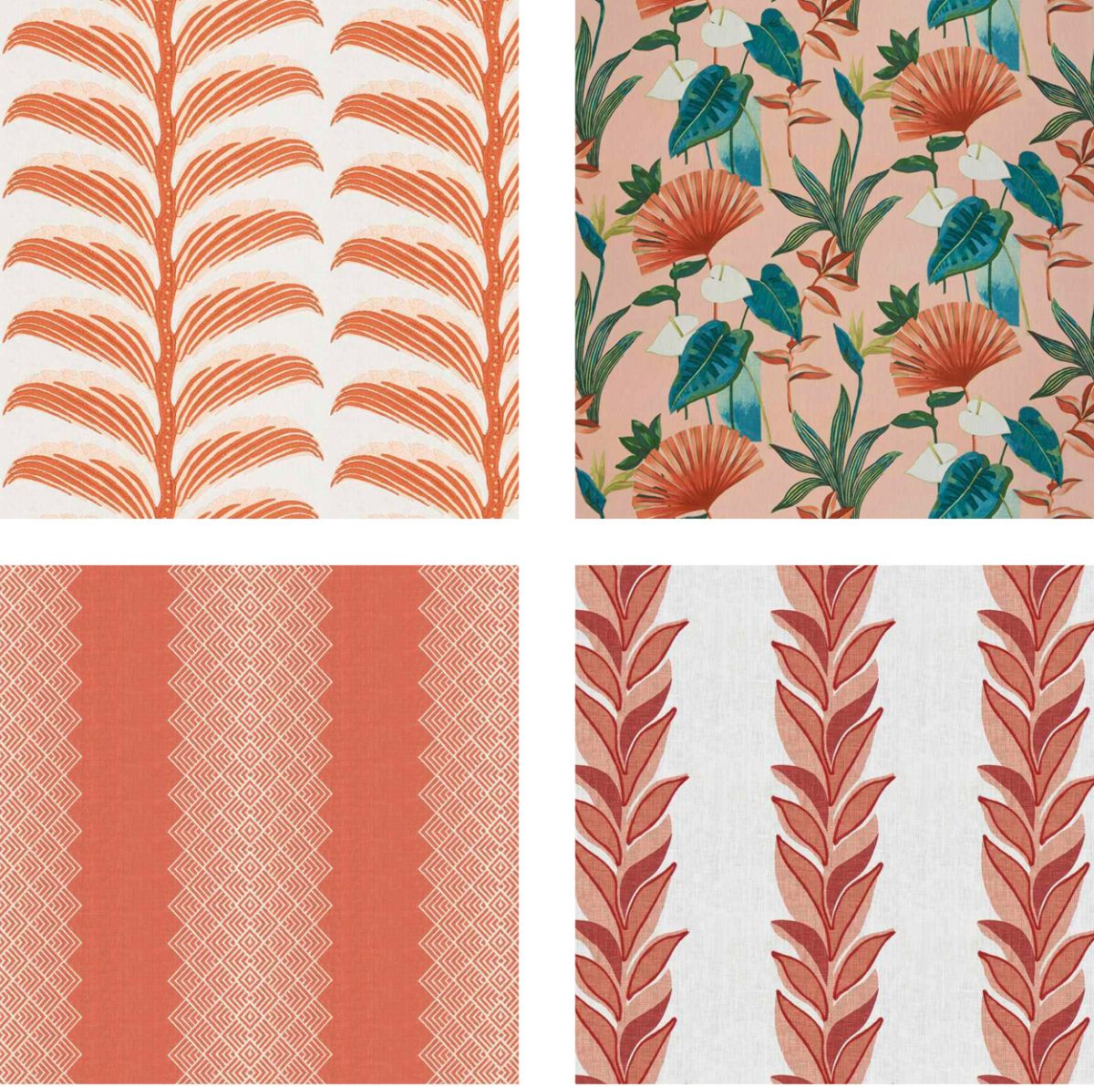 Coral and peaches bring in the softer side of warmth. Stroheim by Fabricut offers options perfect for indoor and outdoor upholstery, custom pillows and drapery. Found in just about any pattern you can imagine, from stripes, small scale patterns, ethnic and global prints, and textured solids to instantly make any area welcoming. Available through Mill End Store.