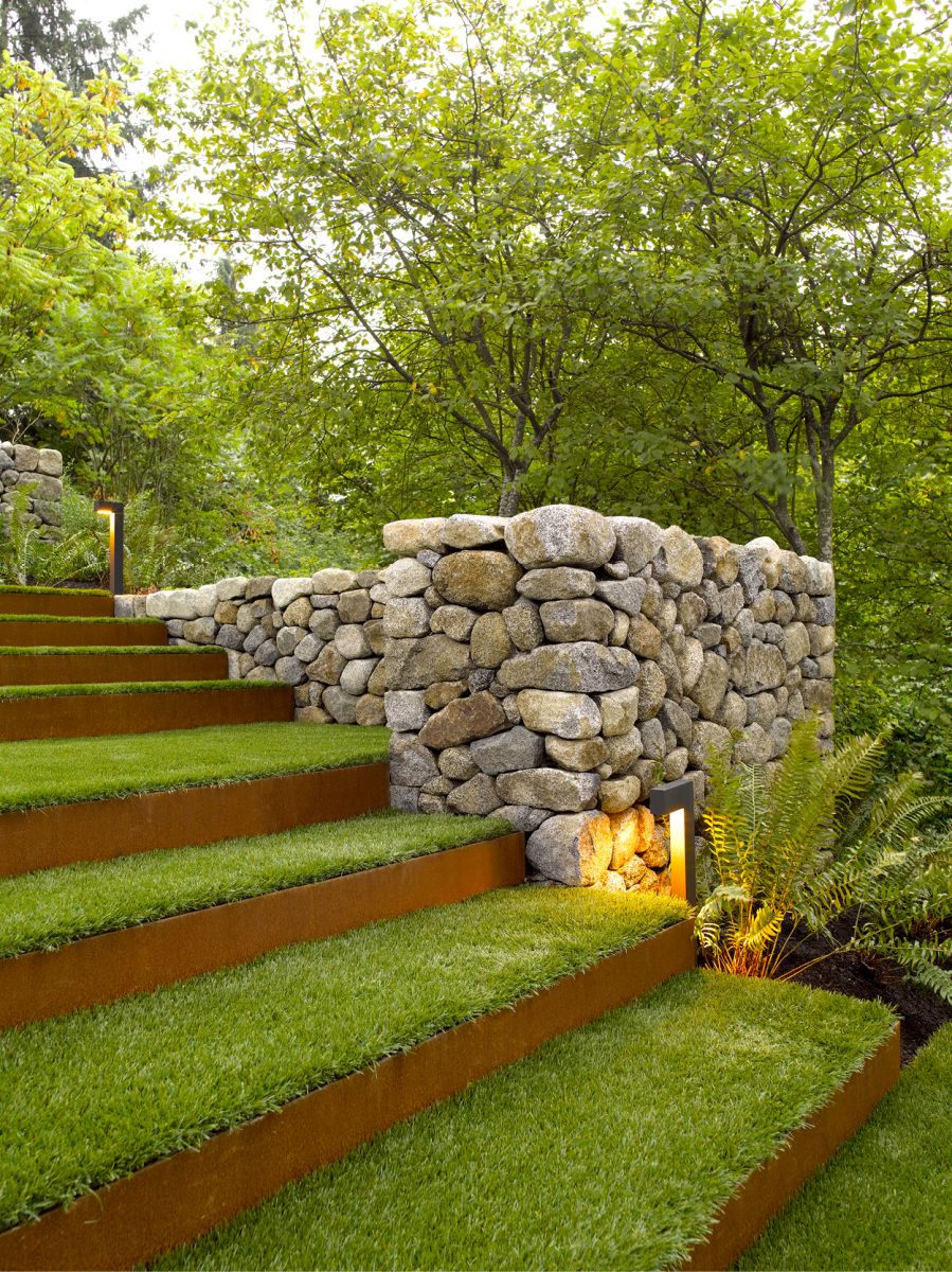 Seattle-based landscape architect Scot Eckley used Corten steel risers to frame grass steps and create landings that terrace down a wooded Mercer Island slope. Dry-stacked Cascade granite walls flank the descent and anchor the path.