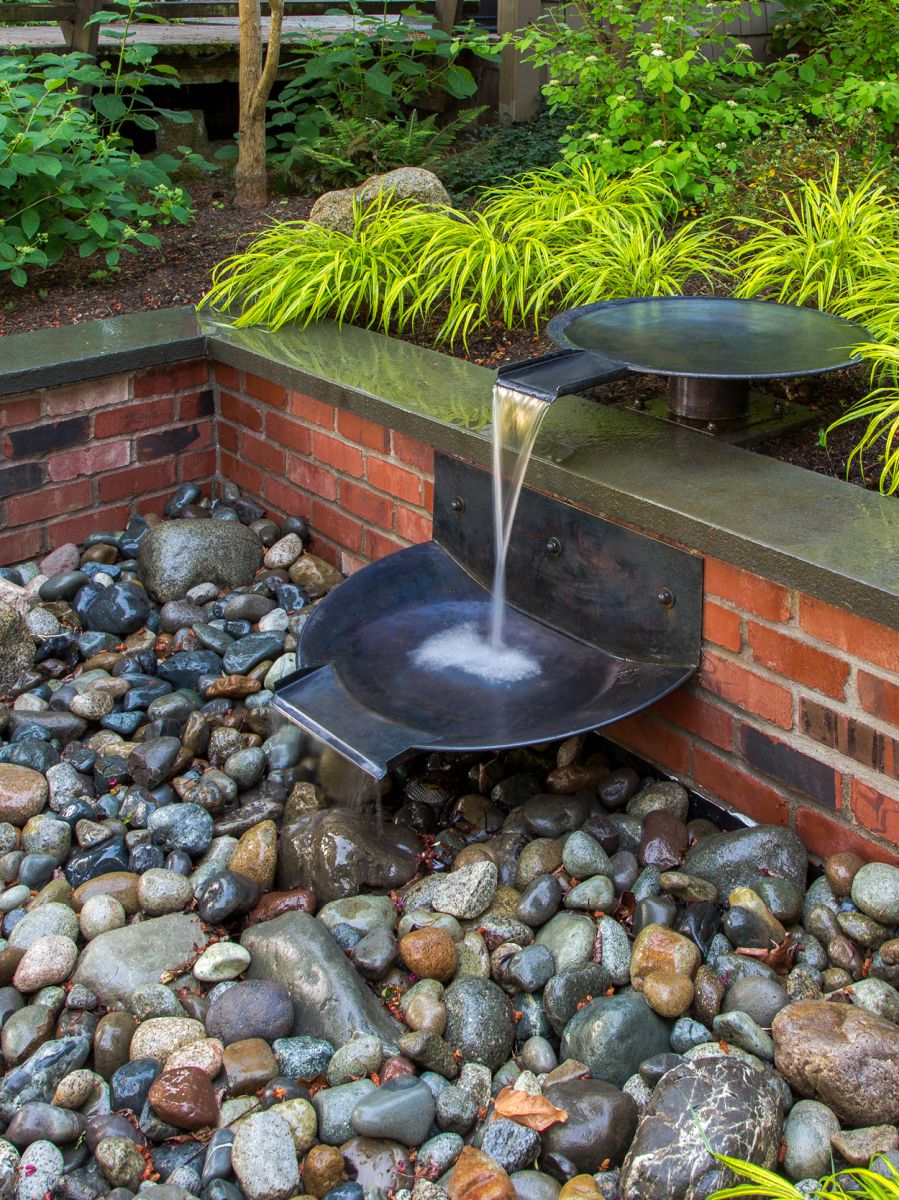 Water flows down tiers of spun copper bowls and disappears in a cistern under pebbles where it recirculates back to the start of the sequence. The design by Cambium even includes a waterproof uplight to provide ambiance at night.