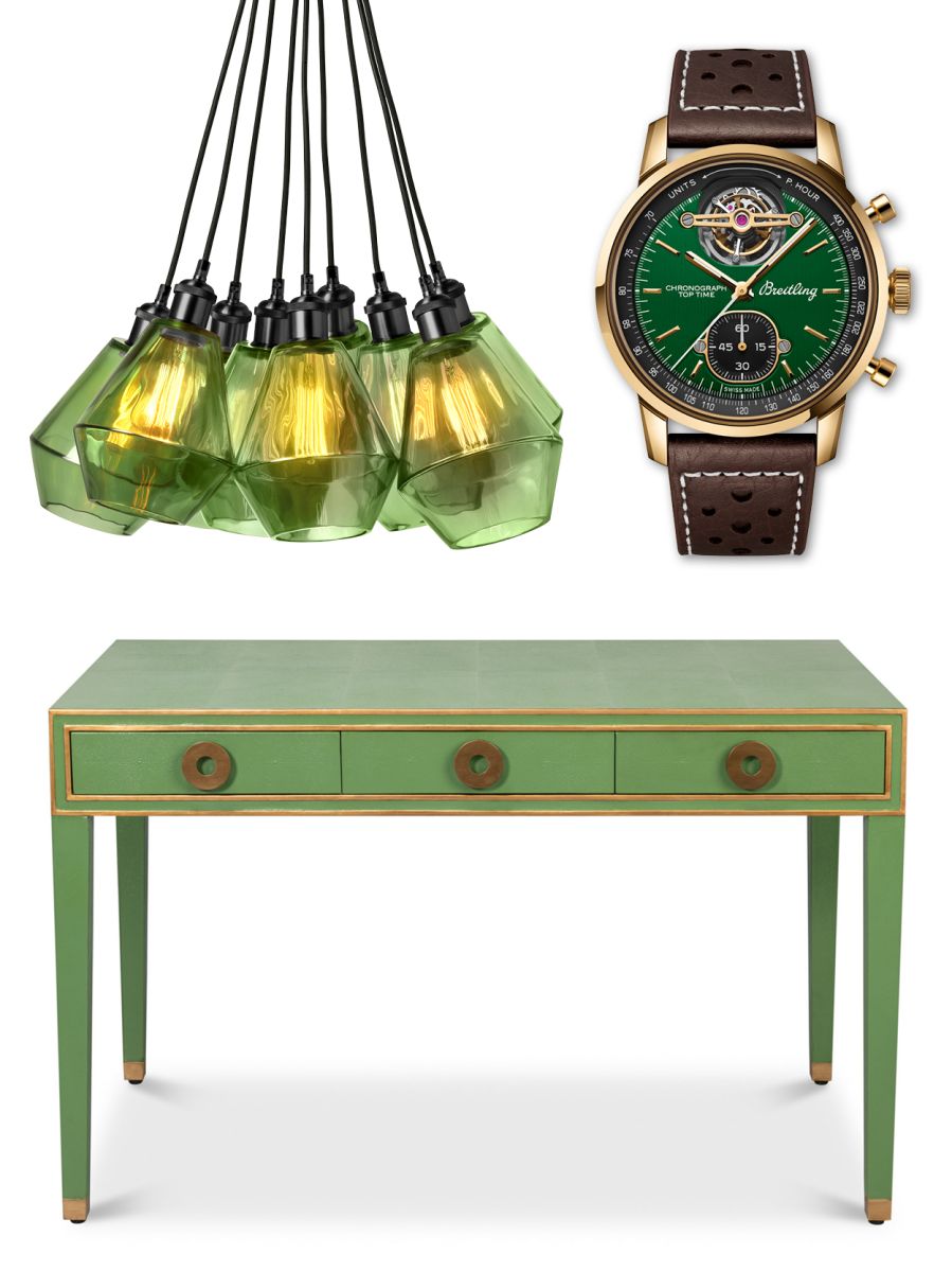The Genesis Pendant light fixture, with a gem-like translucent green glass shade and antique silver hardware can be configured with one, five, or nine pendants.