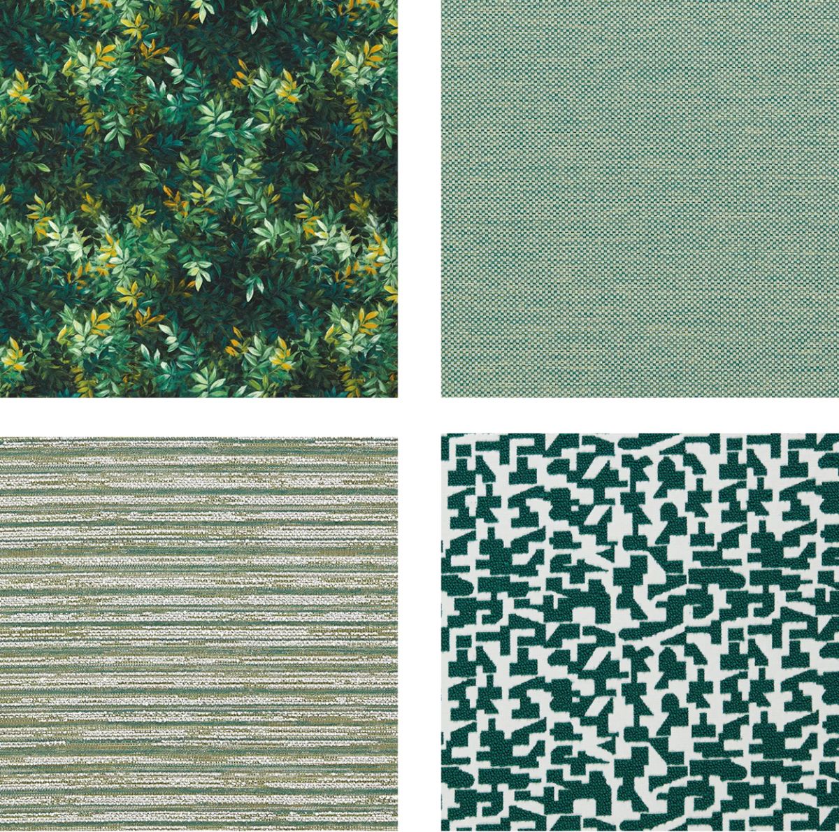 Clarke & Clarke indoor and outdoor fabrics offer warmth and color to your space. Indulge with (left to right) 1. Congo Outdoor Forest, 2. Cameron Forest, 3. Waikiki Forest, 4. Kaleia Forest. Fabrics transform and enliven home decor. Available through Cindy’s Window Fashions.