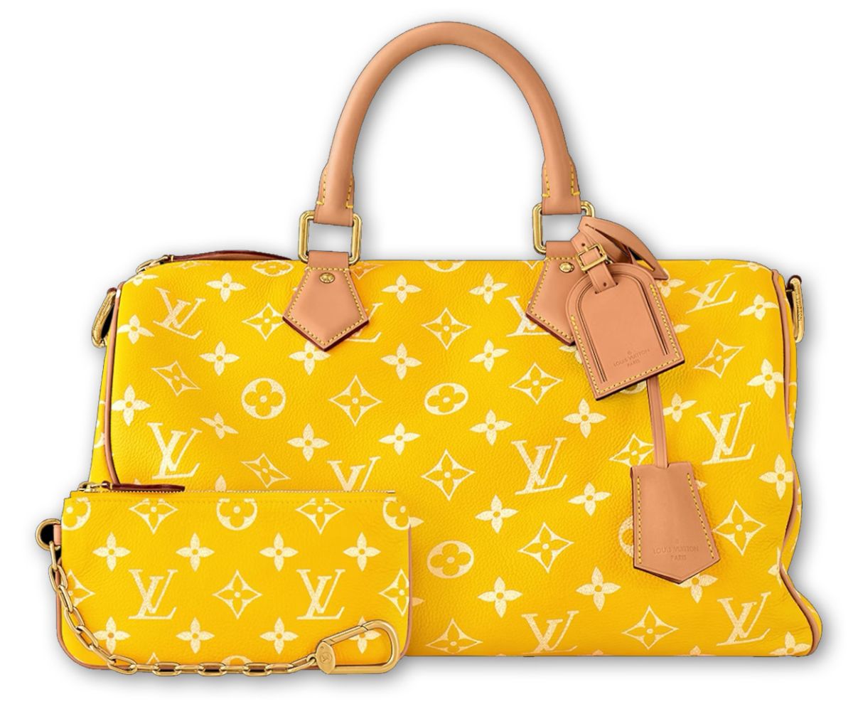 Louis Vuitton’s Speedy P9 Bandoulière  bag in “Jaune Mat” features zipper pocket, and vachetta rolled leather top  handles, interior, trim, and shoulder strap with brass hardware.