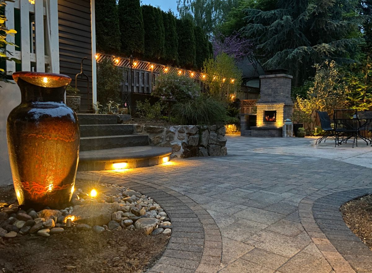 Lit and ready for company, this custom design by Sequoia Stonescapes includes a fireplace in Western Interlock’s Columbia Blend Chateau Block. An inviting patio is created with Columbia Blend Granite pavers, lined with a pewter and charcoal accent border.