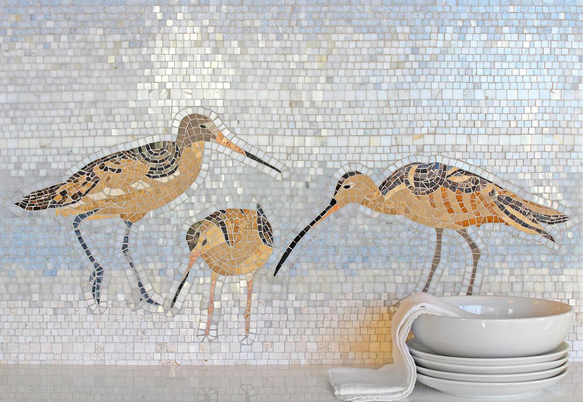 This custom tile design includes shore birds investigating beach offerings. The tile mosaic was created with natural stone colors including Blue Celeste, Calacatta, Carrara, French Vanilla, Roman Blue, Siberian White, and Statuary Mist tile. This handmade tile is available at Cupboard and Clay’s Tacoma showroom.