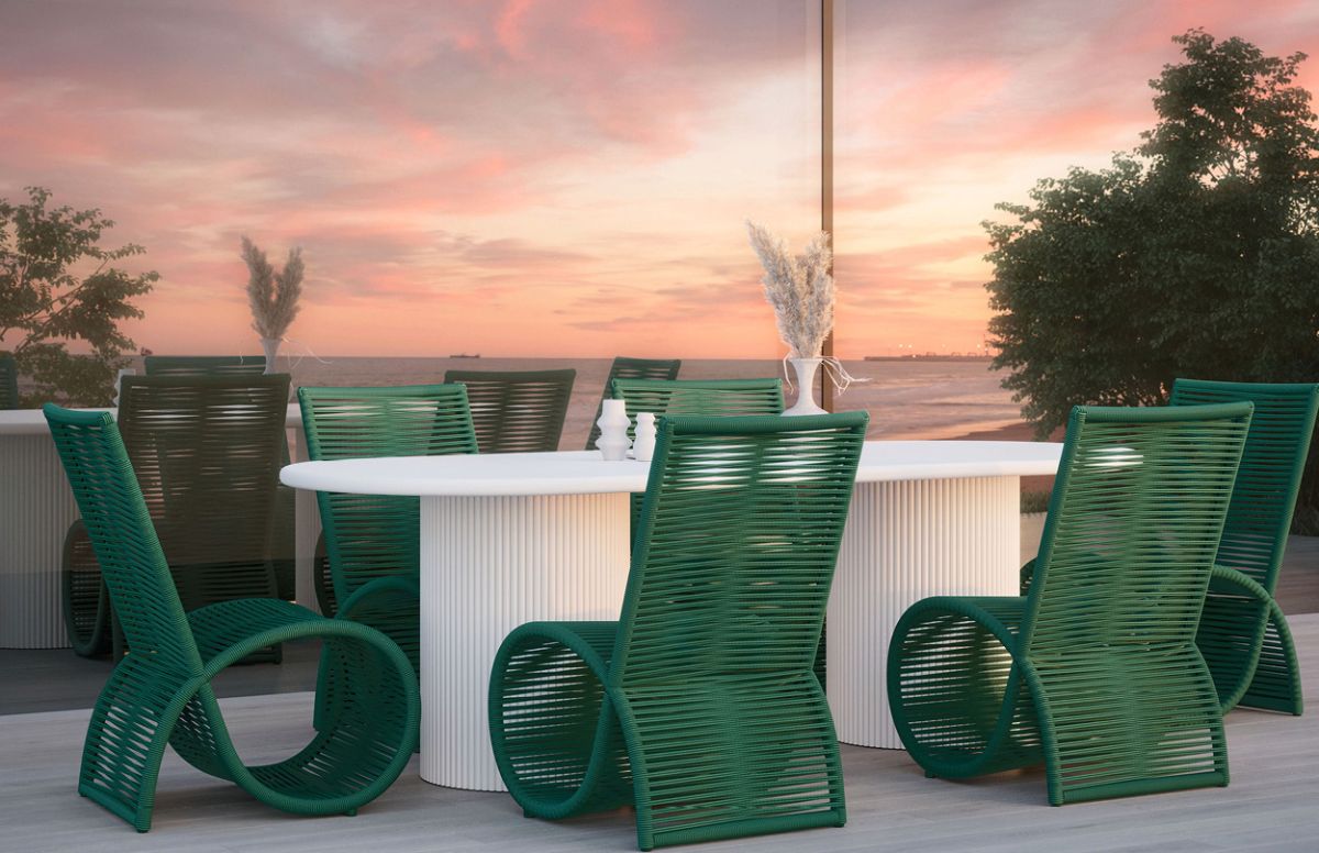 The iconic Wave Chaise Lounge collection by Azzurro Living includes the Club Chair, meticulously crafted with expert welding, weaving, and finishing for durability and performance. The Palma 96” Dining Table is the definition of coastal modern and designed to withstand the harshest elements. Available through J Garner Home.