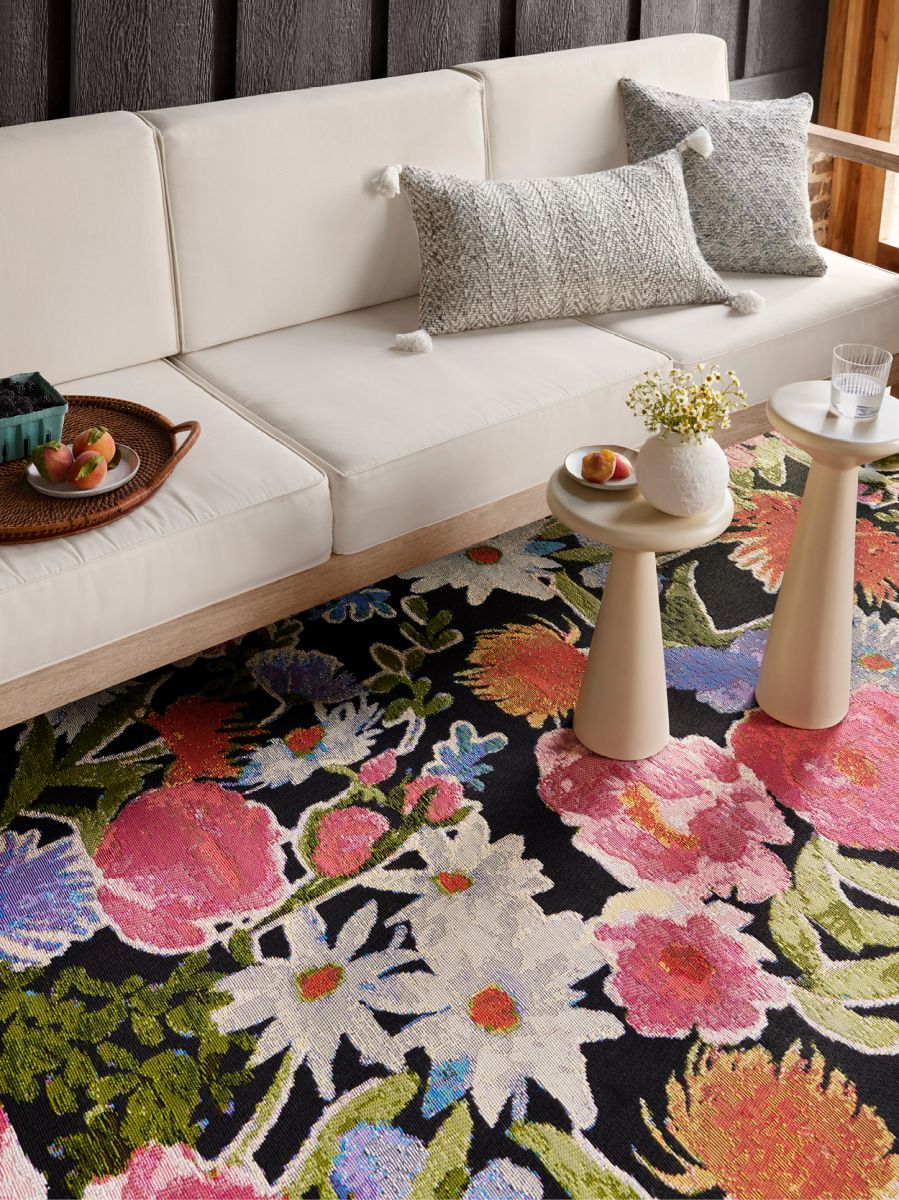 This Loloi Botanical Collection collaboration with Rifle Paper Co goes all-in on large scale flowers with a vintage fabric style. The power-loomed rug is made of mixed materials for indoor and outdoor use, where all that is needed is a rinse with a hose to clean. Available through J Garner Home.