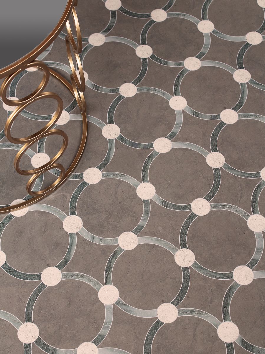 Tile flooring with intricate layouts provide a timeless and durable surface. The design “Set 63 with Adley” combines Waterjet Mosaic in Lagos Azul, Cippolino, and Gasgone Blue Natural Stones. Available at Cupboard & Clay.