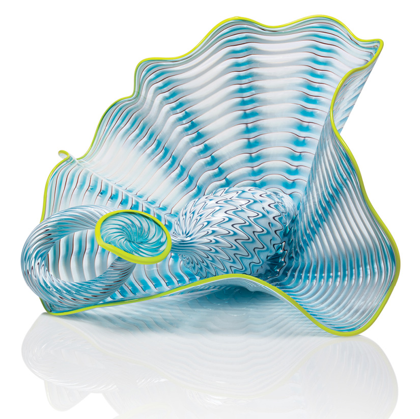 Chihuly’s Glacier Blue Persian series captures the tangible expressions of movement and vibrancy. Eloquent, successive ribbons of icy blue and white glass spiral panoramic waves in this sculpture.