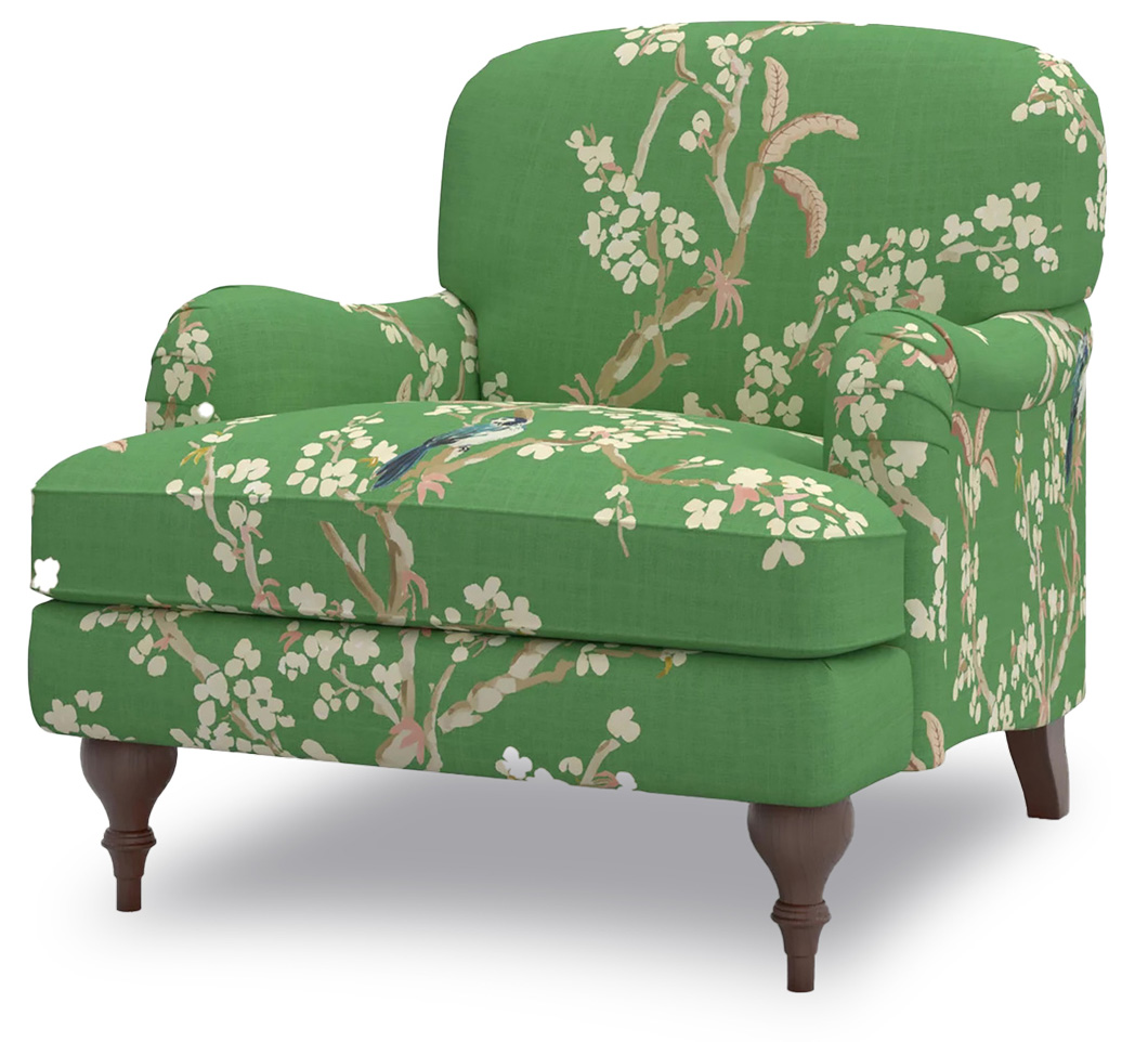 With pleated arms, a rounded seat, and ornate wooden legs. The Inside English Roll Armchair in Jade Cherry Blossom fabric is brimming with traditional charm and a reversible, down-alternative cushion.