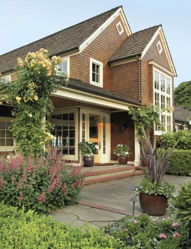 Using an easy-care palette of plants selected for texture, Michael was also able to direct guest traffic around the exterior spaces, linking decks, porches, and arbors to lure visitors from one area to another. One can choose the quick route to the house and back garden using a paved walk, or meander down a grass path, lingering to watch the hummingbirds. Such grasses as golden feather grass, Stipa gigantea, give a lace curtain effect for summer and autumn, hinting at just enough separation between the two parallel paths to give each character, yet imparting a touch of mystery to the vine-clad arbor glimpsed just around the corner from the front porch, where the paths meet. Such techniques as this, using diaphanous textures to obscure a sight line and create intrigue are hallmarks of inventive garden-making.