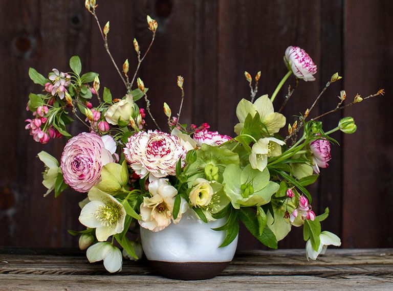 A glorious display of pink spring perfection, flowering crabapple branches and saucer-shaped flowers of early blooming hellebores pair with frilly Butterfly ranunculus to welcome the sunny days ahead. ...