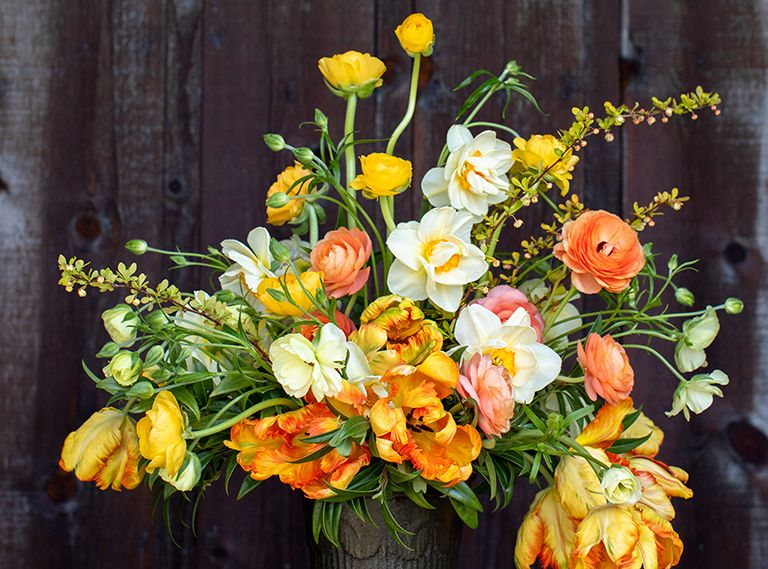 There’s so many reasons to love spring blooming Ranunculus. The flowers look almost too perfect to be real. Their rose-like blossoms feature layer upon layer of tissue-thin petals in colors that range from cream and pale yellow to apricot, pink, orange, red and burgundy. Long-lasting and versatile, they tuck beautifully into bouquets. Paired here with lively tulips, delicate forget-me-nots, trailing Akrebia vine and “Amber Jubilee” Ninebark branched — all in a luscious apricot pallette!