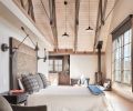 “When we were engaged,” says Kyle, “there was just a slab-on-grade footprint for the proposed red gabled barn. When they decided to use the barn to entertain family and friends, we suggested reshaping it to fit the landscape. By modeling it after a classic roof style with hay storage above, we broke down the rooflines and incorporated dormers to let light into the upstairs and living areas and to break down the scale. The dormers became bedrooms that can handle a larger than king size bed.” SkB Architects suggested nixing the red barn for something more sympathetic to the landscape. “We showed them some dark barns,” recalls Kyle, “which made it more a part of the orchard rather than an object alongside it. The black hued stain used on the wood siding was applied with steel wool and vinegar to help form a silver, gray patina over time.”