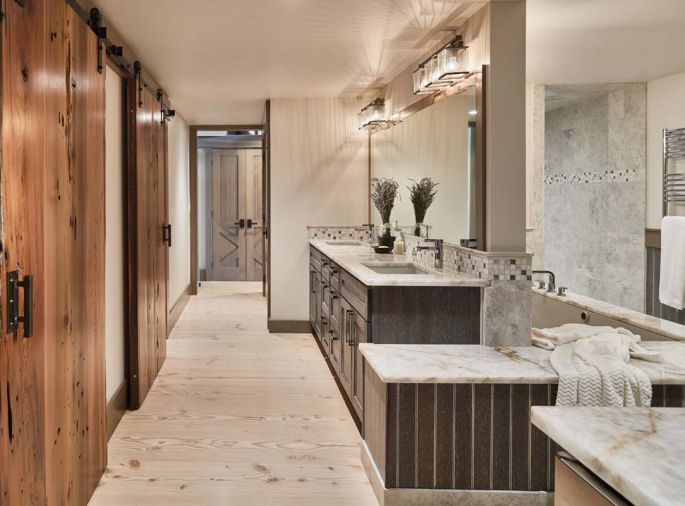 Inspiration was also a group effort. For instance, a beautiful cedar tree pulled from a lake was milled and turned into the sliding barn doors in the wine cellar and master bathroom. Three welders joined the team, some working on site. Mark Strain of Strain’s Custom from Manson fabricated SkB’s pot rack design and created the mezzanine railing. “Mark started with the big “X” design,” says Charlie, “followed by an abstract of the barn on one side and apple trees, apples and apple blossoms on another.”